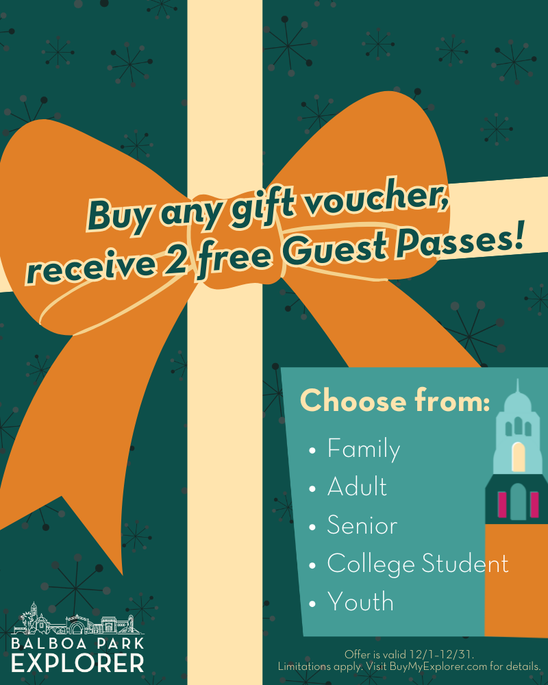 This offer is valid 12/1/25 – 12/31/25 and is only available on the Balboa Park Explorer website or over the phone at (619)-232-7502, Press 2. Gift Vouchers are available for Family, Adult, Senior, Student, and Youth Annual Passes. Each Guest Pass grants one admission to each of the 16 participating museums* for one day only, on the day of first use. Guest Passes are physical tickets that will be mailed with the physical Gift Voucher. Guest Passes are unnamed and can be shared. Guest Passes must be used within one year from the printed date. This promotion is limited to up to 4 Guest Passes per Household.